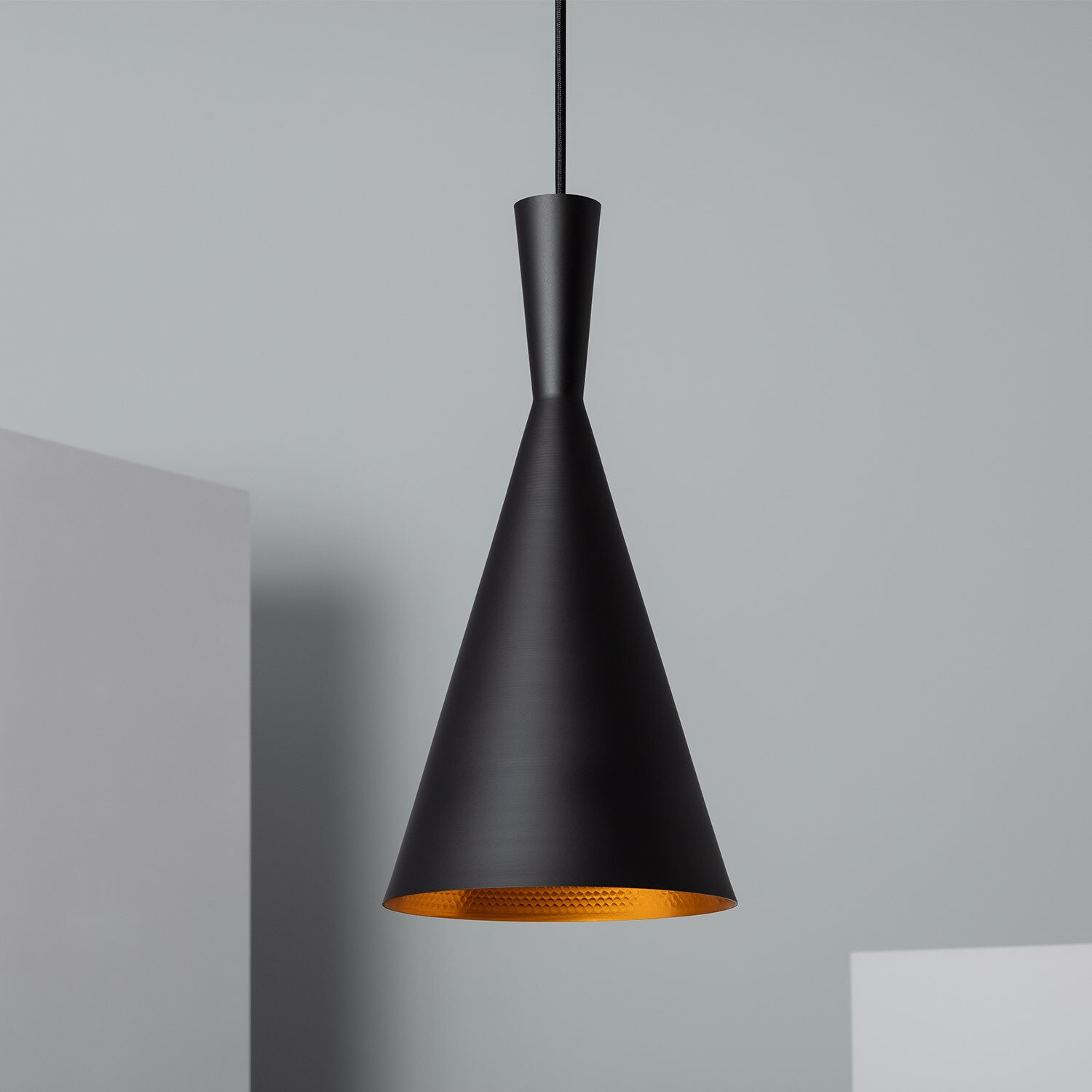 🔹 Acabado en negro mate con interior dorado, ideal para resaltar ambientes cálidos.