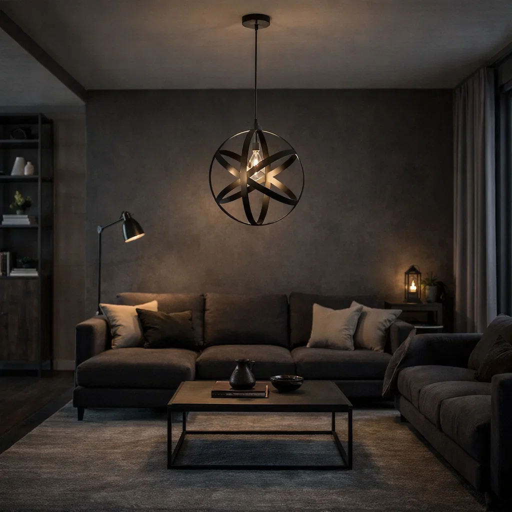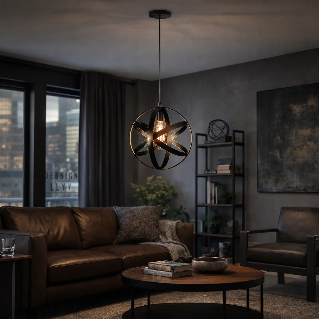 La Lámpara Colgante Ylena destaca por su diseño geométrico en forma de esfera abierta, ideal para aportar un estilo moderno e industrial a cualquier ambiente. Su estructura metálica en color negro crea un efecto visual elegante y liviano, permitiendo que la ampolleta sea protagonista y proyecte la luz de forma atractiva en el espacio.