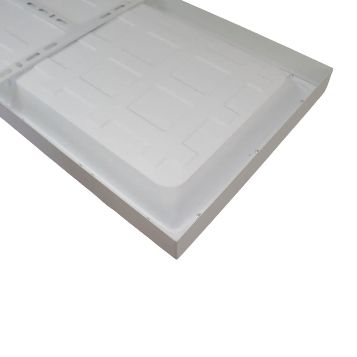 Fabricado con marco de aluminio blanco y difusor de PMMA, proporciona luz directa de gran calidad. Este modelo incluye driver electrónico y está diseñado especialmente para montaje sobrepuesto en cielos sólidos o de concreto, facilitando la instalación sin necesidad de estructuras empotradas.
